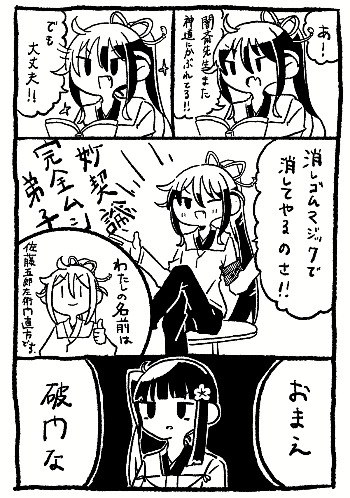 崎門小ネタまとめ② 崎門 2026.01.06 崎門小ネタ漫画まとめ② 直方特集 皓歯って美女に使う表現じゃない…?直方に関する記録は、弟子が残したものであることを差し引いても、なんか直方にメロついてて男が惚れる男だったのかな…と思ったり…知らんけど…。どうなんだろう…。 闇斎先生は後年、垂加神道なるものを説きだします。しかし、弟子筆頭であった直方はこの世に道は1つであり、神道が正なら儒が邪・儒が正なら神道が邪(=両方の教えを両立することはありえない)と主張し、闇斎先生と袂を分かちます。 favorite0いいね送信中です×※コメントは最大500文字、5回まで送信できます送信送信中です送信しました!