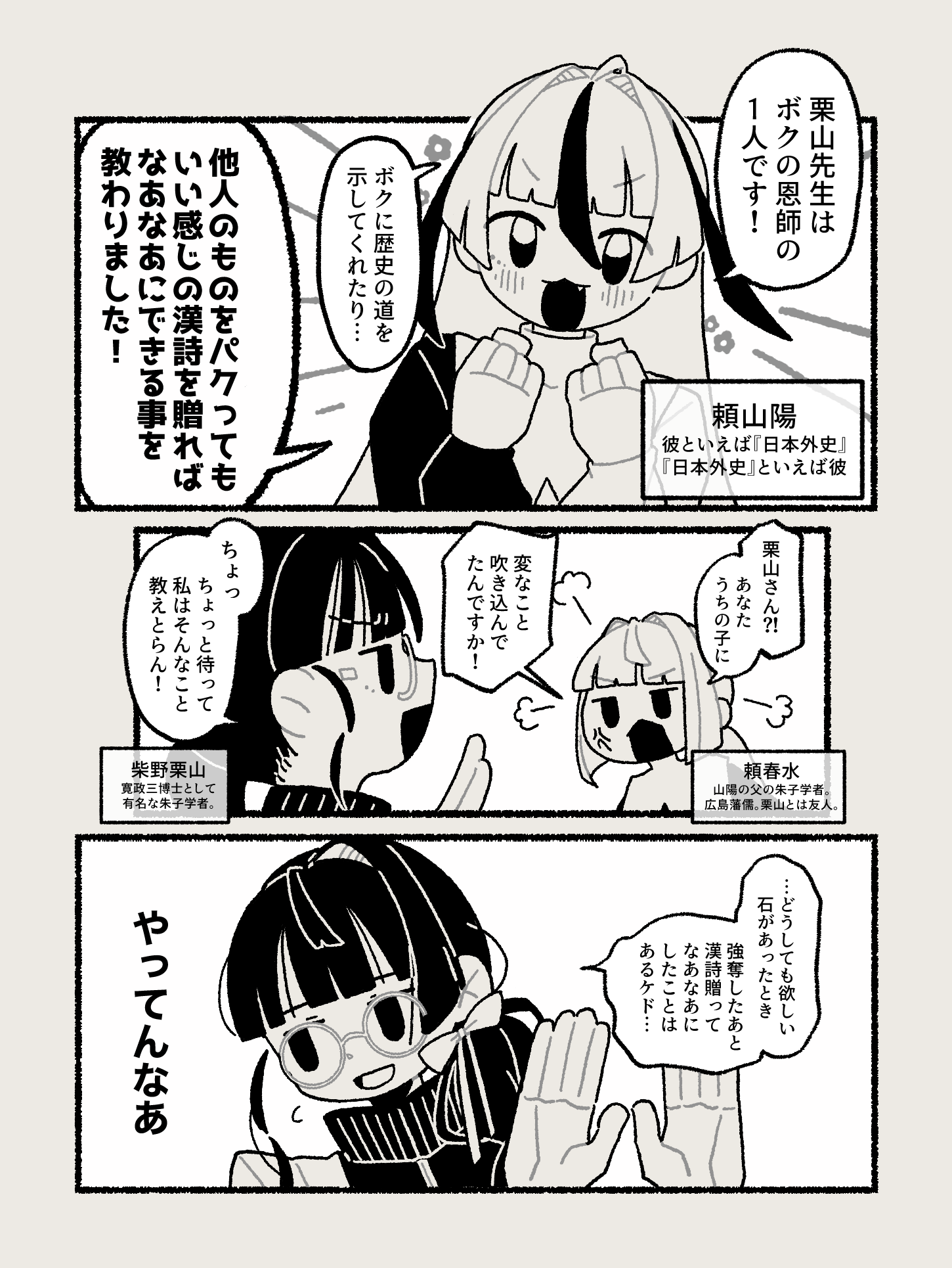 やはり人の名品を奪う 江湖の文人 2026.01.08 悪癖ふたたび(頼山陽、柴野栗山) 栗山さん、ものすごいお堅い先生なのにこういうことはするのちょっと意外だった。てかこの時代の文人たち、いいものあったらすぐしれっと自分のものにしようとしがち。 favorite2いいね送信中です×※コメントは最大500文字、5回まで送信できます送信送信中です送信しました!
